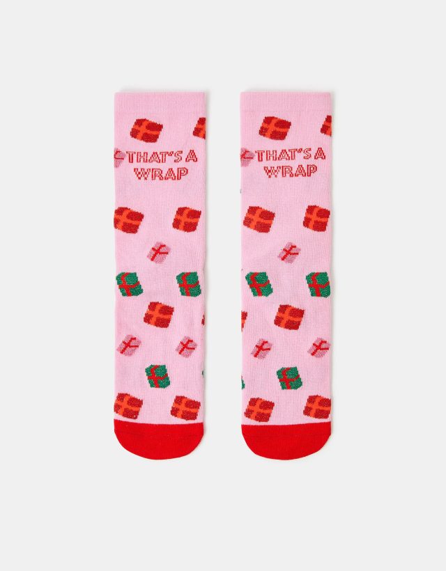 Made from a soft blend in bubblegum pink and festive red, these socks showcase a pattern of perfectly wrapped presents with ‘That’s A Wrap’ below the top hem.