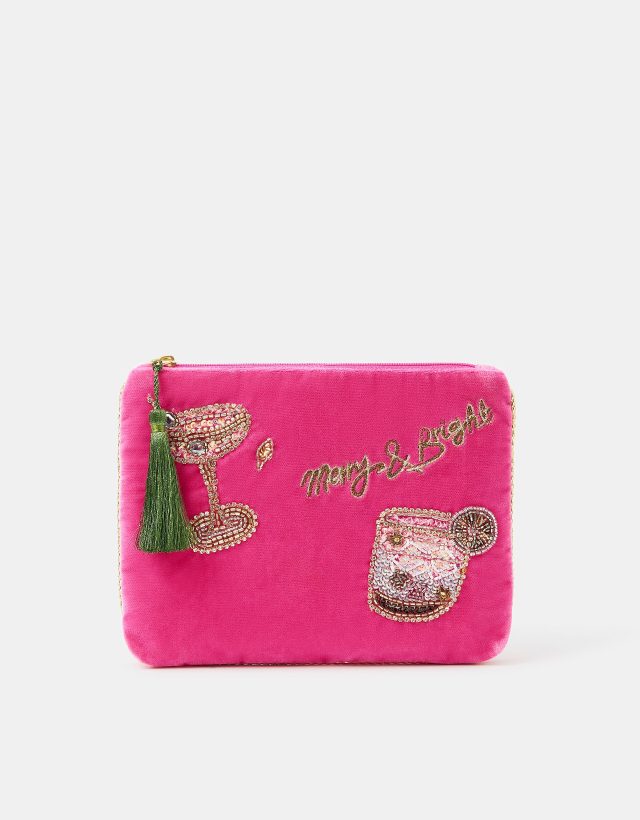 May your days (and accessories) be merry and bright! A cute gift for anyone this Christmas, this pouch is designed in pink velvet with beautifully beaded cocktail motifs stitched on the front.