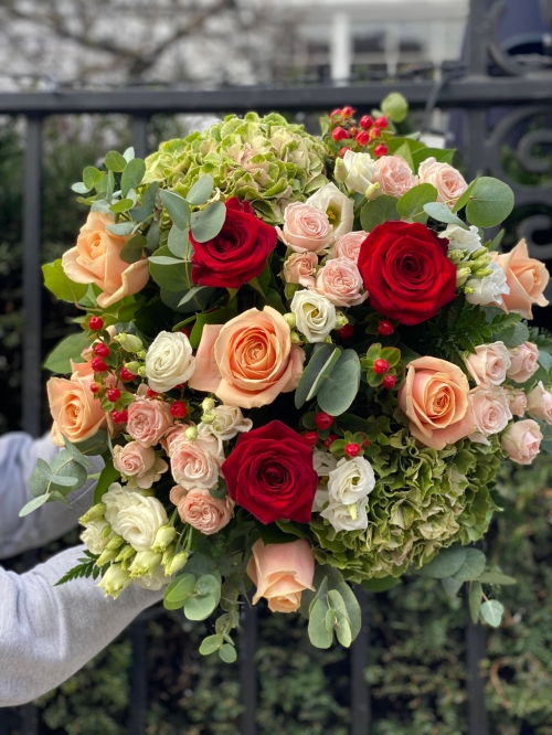 This Je Taime arrangement is a captivating blend of deep reds, soft peaches, blush pinks, and whites, accented with beautiful crisp greens.