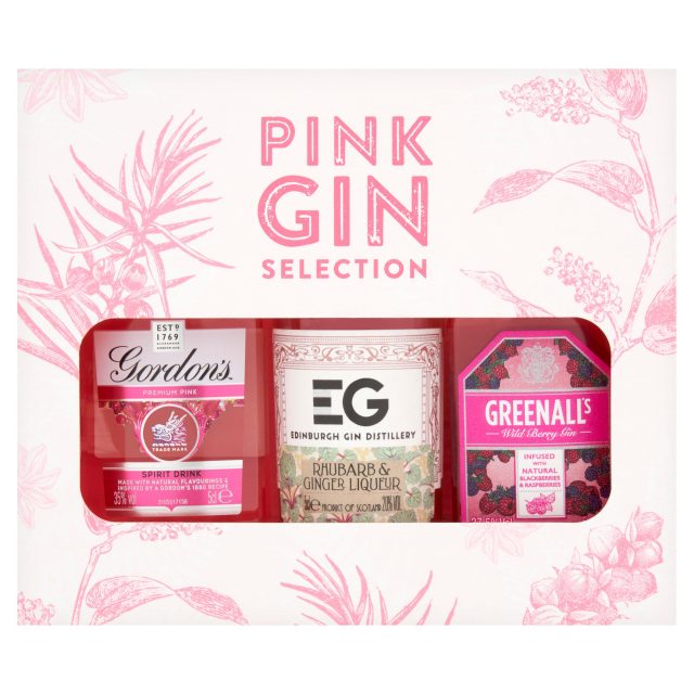 Selection of pink gins, including Greenall’s Wild Berry Gin, Edinburgh Gin Rhubarb & Ginger Liqueur and Gordon’s Premium Pink Gin-Based Flavoured Spirit Drink.